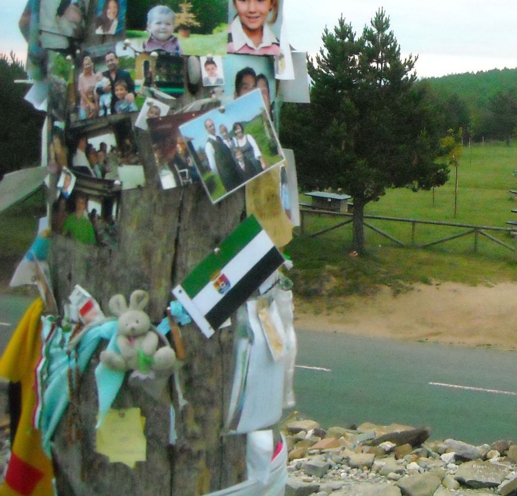 Papelitos descoloridos, lazos deshilachados, banderitas mugrientas, fotos de difuntos, notas plastificadas, restos de todo tipo… todo vale para dejarlo allí, hacerse la foto de rigor y salir pitando cuesta abajo en dirección a Ponferrada, que no habrá sitio en el albergue.