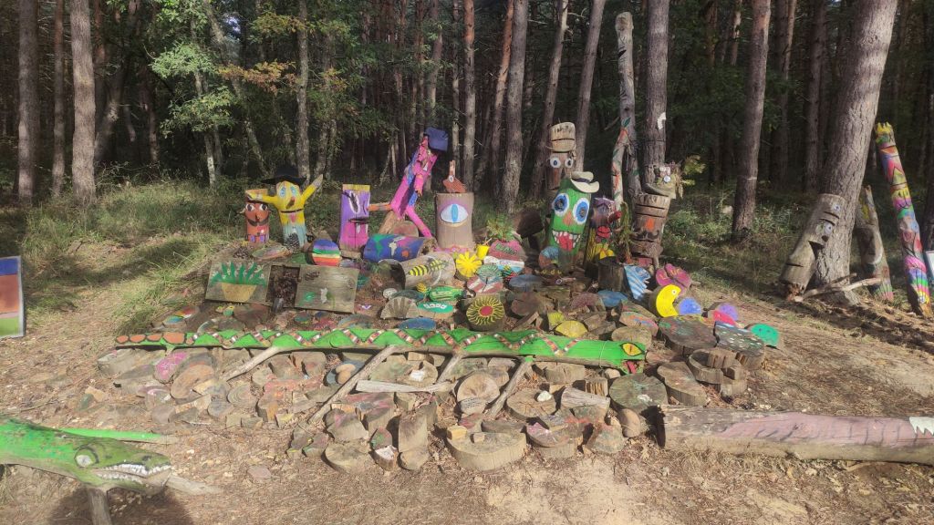 Pinos, más pinos, largos cortafuegos y, sobre todo, una sensación de soledad bastante intensa nos acompañaran en esta parte de la etapa de hoy. Fuera de temporada alta, este tramo impone. No es difícil imaginar por qué antiguamente era territorio de bandoleros: aislamiento total, silencio y kilómetros sin cruzarte con nadie. Para rematar el ambiente, aparece algún que otro monumento bastante inquietante que no ayuda precisamente a relajarse.
