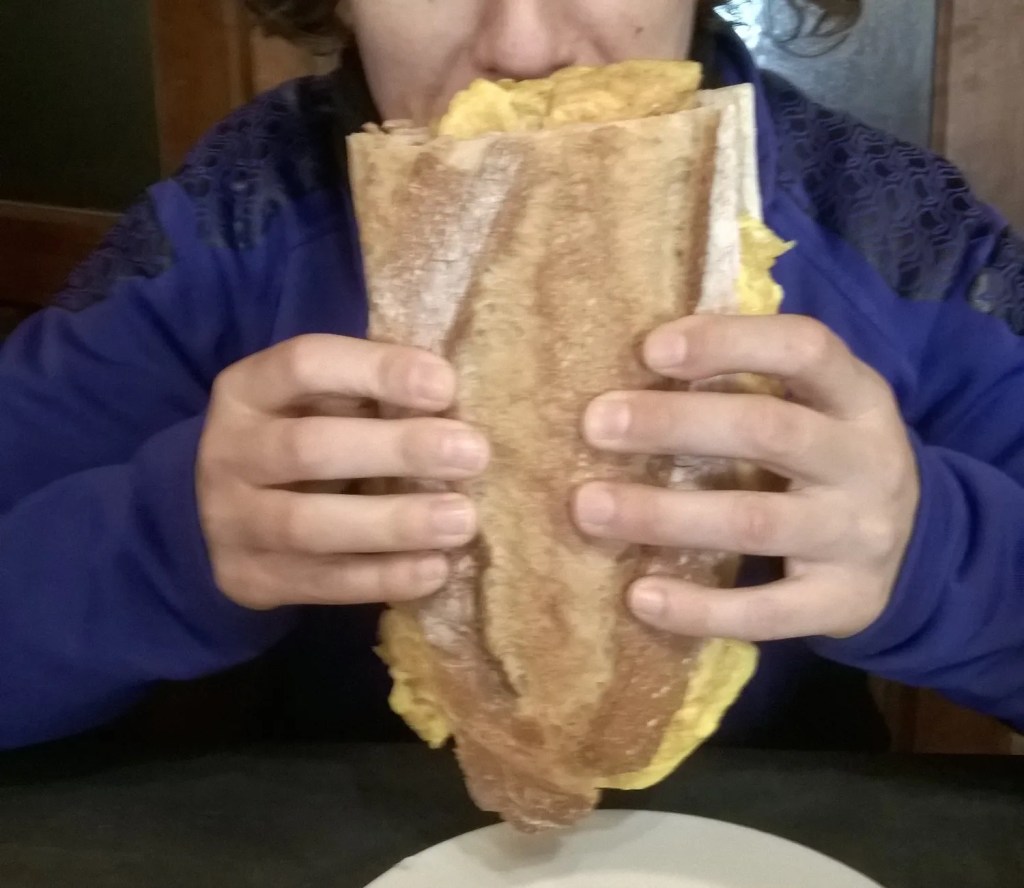 Allí, cuando ya pensábamos que esta primera etapa desde Sarria sería más trámite que experiencia, apareció un bocadillo de tortilla descomunal, de esos que reconcilian al peregrino con la humanidad y con el propio Camino. Mano de santo.