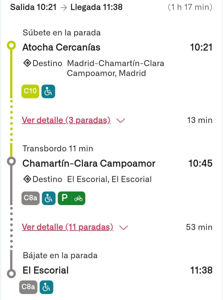 Además, hay un punto clave que aporta mucha tranquilidad: los trenes de Cercanías desde El Escorial salen cada hora. Nosotros encajamos perfectamente el horario, pero si la ruta se alarga o surge cualquier imprevisto, siempre existe la opción de coger el siguiente tren. Eso sí, en ese caso probablemente tocaría sacrificar la parada en Plaza Mayor y el bocadillo de calamares… pero el plan B sigue siendo totalmente viable.