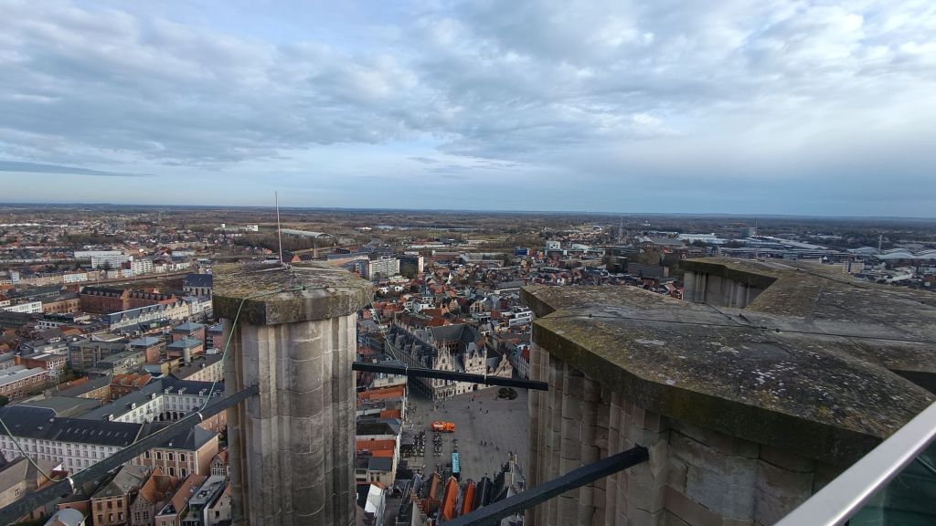 La vista desde arriba es magnífica. En días claros se distingue Bruselas, con el Atomium, y también Amberes. Unos binoculares electrónicos (gratuitos) que hay en lo alto señalan incluso Gante, aunque nosotros no conseguimos verla a simple vista. Eso sí, aviso importante: no intentéis hacer la foto del Atomium con el móvil, porque la distancia hace que el resultado sea bastante decepcionante, por no decir penoso.
