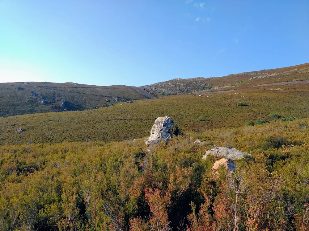 La primera parte de la subida es de lo mejor, ya que se atraviesan unos prados y unos brezales, conocidos por los locales como La Calera, donde la inmensidad del llano y de las montañas que lo rodean resulta abrumadora.