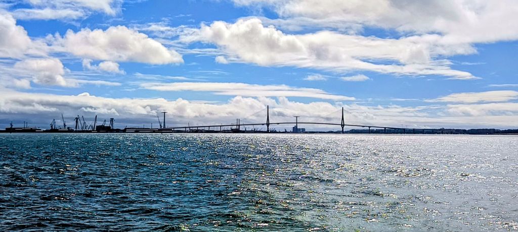 Aunque también se puede ir en tren, en esta ocasión nos hizo especial ilusión atravesar la bahía de Cádiz en un barco panorámico (curiosamente integrado en el sistema tarifario del transporte público de Cádiz y que nos costó la irrisoria cifra de 2.90 euros por persona).