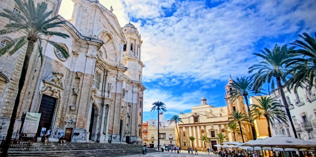 Saliendo de El Pópulo por el Arco de la Rosa, llegamos a lo mejor de Cádiz y lo que más nos gustó, que es la Plaza de la Catedral, con el edificio más fotogénico de la ciudad: La Catedral Nueva o de la Santa Cruz de Cádiz de estilos barroco y neoclásico.