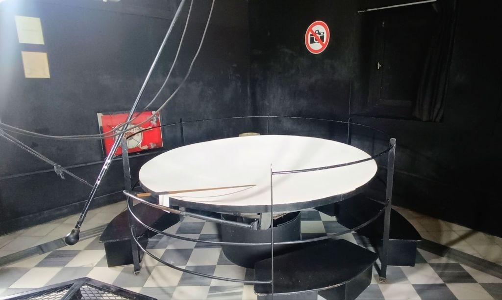 Esta cámara, gracias a un agujero del techo, y de unos espejos y lentes en un tubo, permite ver lo que pasa fuera, dentro de la pantalla, con una nitidez asombrosa.