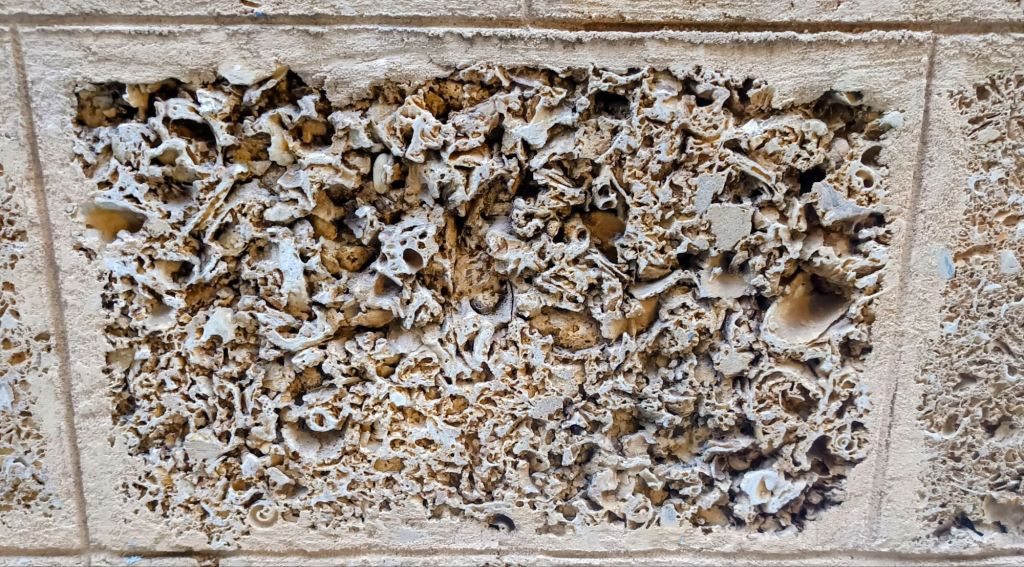 Esta piedra sedimentaria, compuesta por moluscos y arena, compactados a lo largo de miles de años, era un material muy barato y abundante en aquella época y la mayoría de edificios están contruídos con este material.