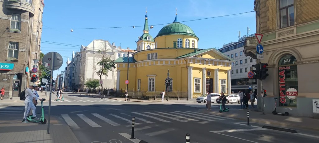 La Catedral ortodoxa de la Natividad de Cristo, la primeras de las tres catedrales que hay en Riga, aparece de golpe, en un parque, cuando menos te la esperas, y te deja sin palabras por su exótica belleza.