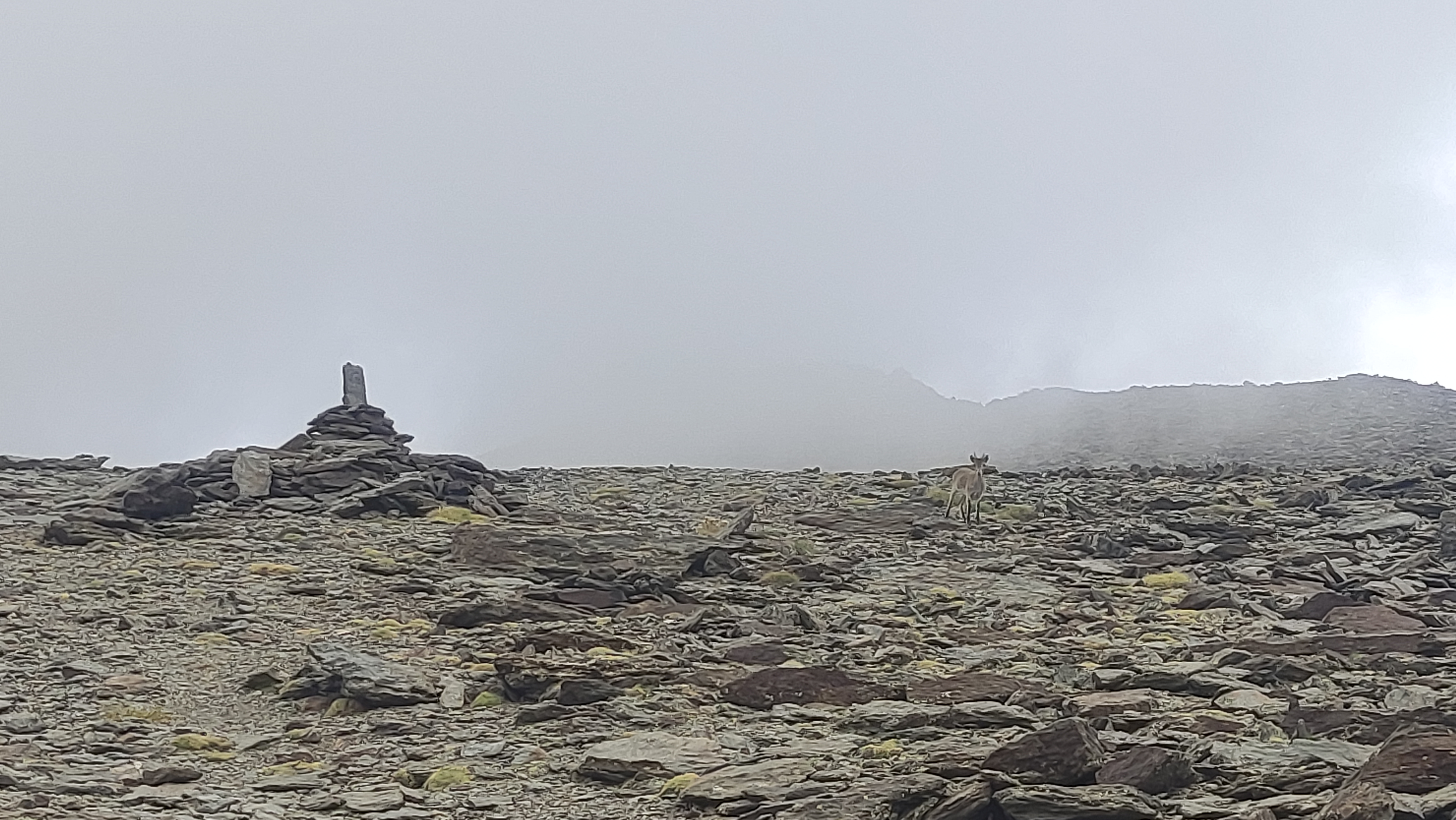 Desde la cima del Mulhacén las vistas son espectaculares. Frente a nosotros se alza el Pico Veleta, y hacia el sur se distingue incluso el inmenso mar de invernaderos de El Ejido (esos que también se ven a simple vista desde la luna), visible a kilómetros de distancia. A menudo también aparecen cabras montesas, totalmente acostumbradas a la presencia de caminantes.