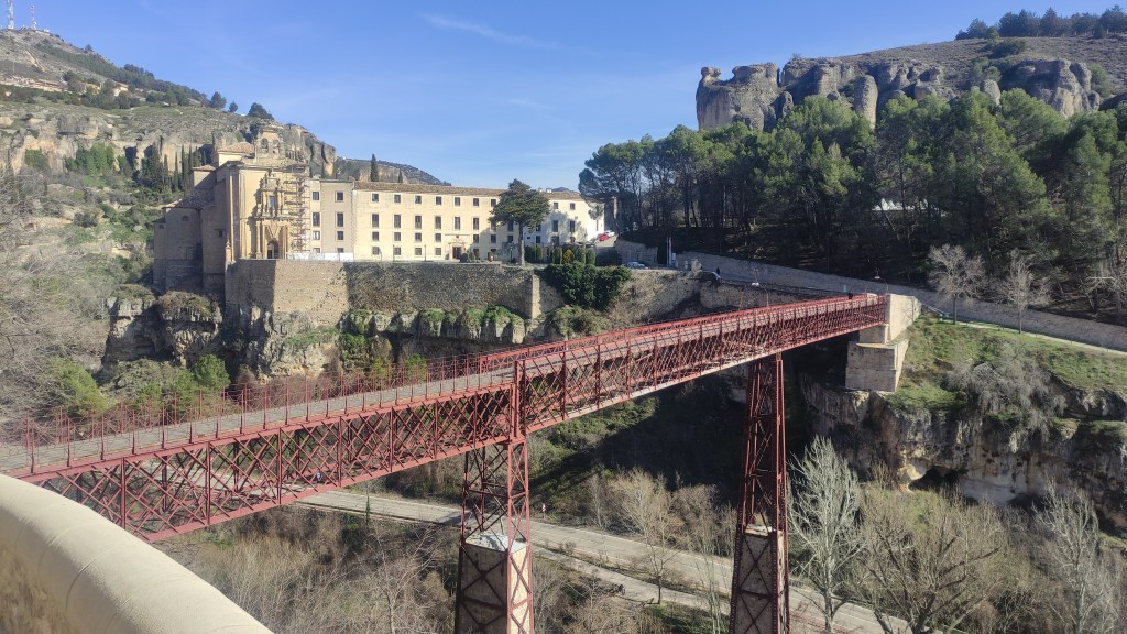 A escasos minutos caminando desde allí aparecen las Casas Colgadas, el gran icono de la ciudad. Suspendidas sobre la hoz del Huécar, parecen desafiar la gravedad. El mejor punto para entender su magia (y para nosotros el único) es cruzar el Puente de San Pablo (se mueve y puede provocar vértigo) y contemplarlas de frente, con el vacío bajo los pies y la piedra colgada sobre el abismo.