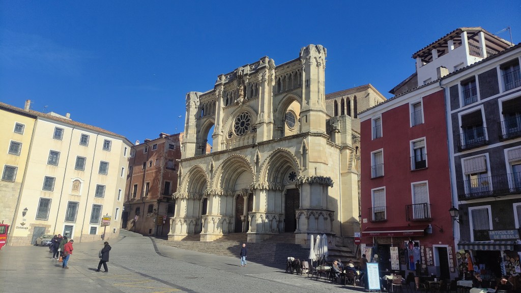 Lo primero que veremos (literalmente al bajar del autobús) es la Catedral de Cuenca. Imponente, elegante y sorprendentemente francesa en su estilo (impacta lo poco convencional que es), fue una de las primeras catedrales góticas de España. Merece la pena entrar si disponéis de algo de tiempo, pero incluso solo contemplarla desde la Plaza Mayor ya justifica la parada.